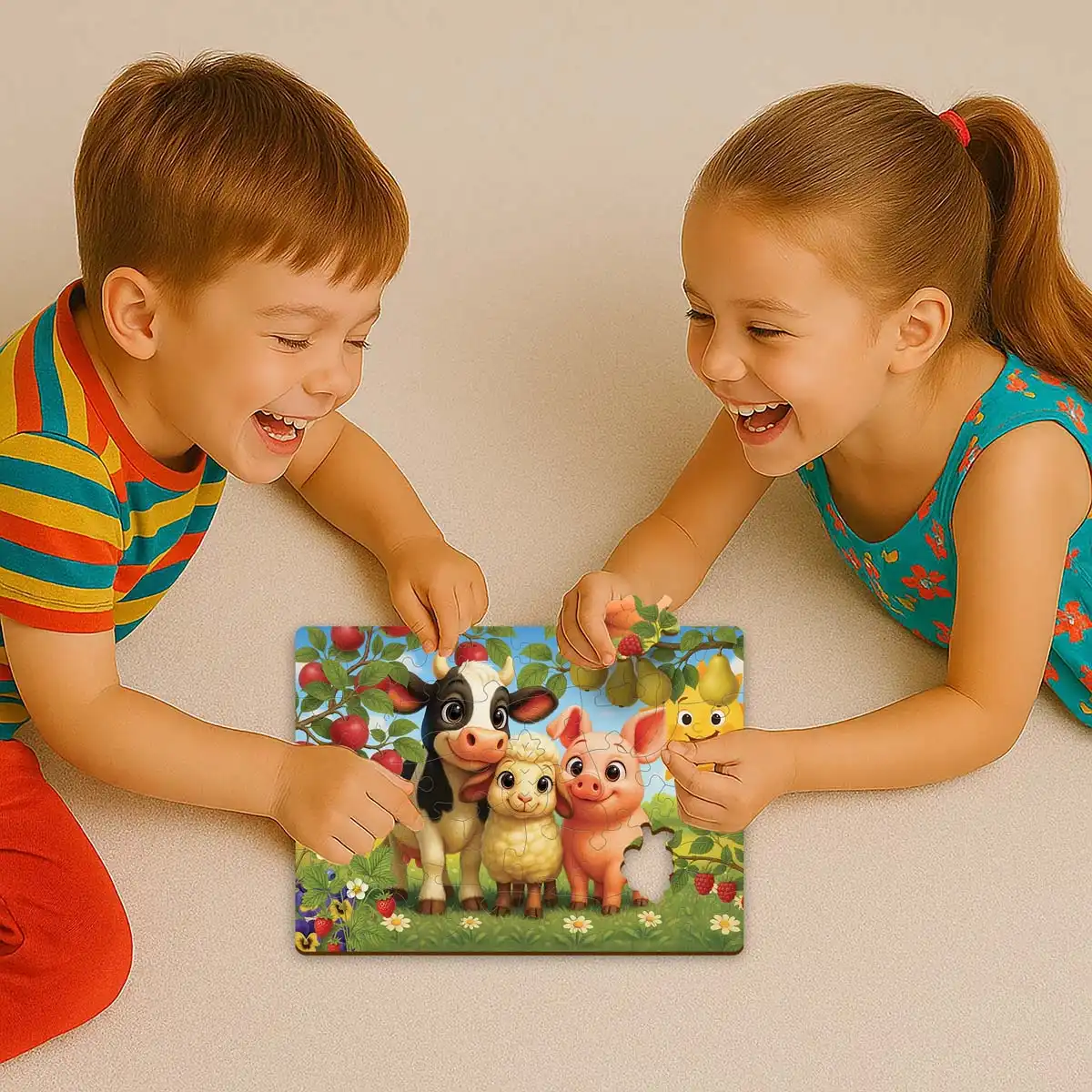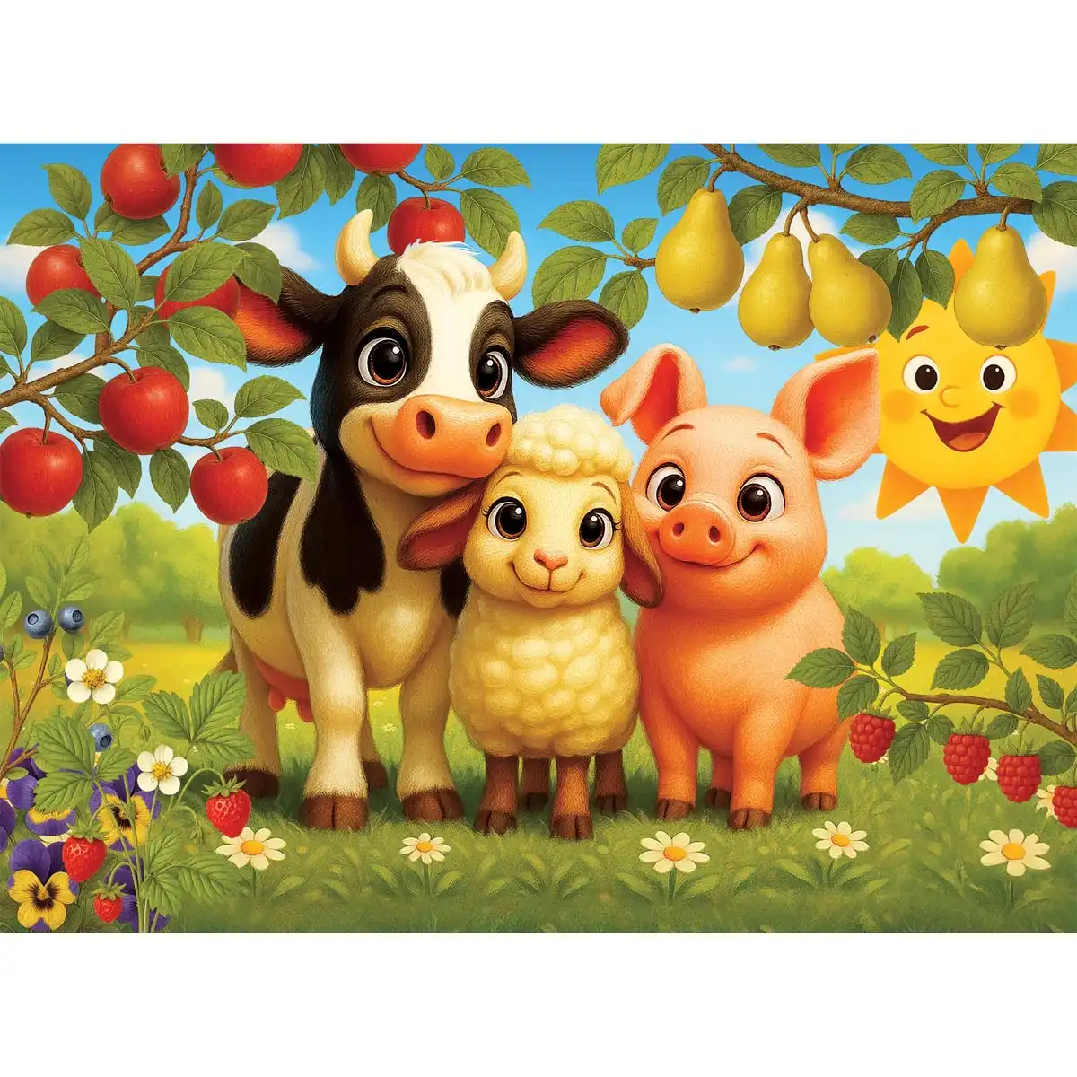 Puzzle drewniane 40 Zwierzęta w Sadzie opowiadają historię dobroci, przyjaźni i harmonii z naturą. Każdy element łączy się idealnie, tworząc obraz pełen koloru i radości. Krówka stoi spokojnie pośrodku, owieczka tuli się do niej, a mała świnka uśmiecha się serdecznie. Wokół dojrzewają jabłka, kwitną kwiaty, a w oddali słychać śpiew ptaków. Scena emanuje spokojem i szczęściem, ucząc, że prawdziwa radość tkwi w prostocie.